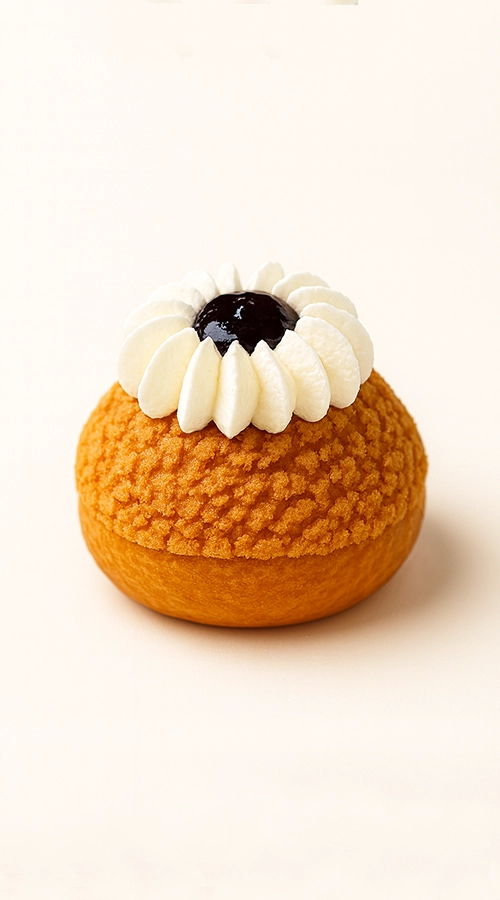 Chou garni d’une crème légère vanille–kirsch, accompagné d’un confit de cerise noire et d’un chantilly.
